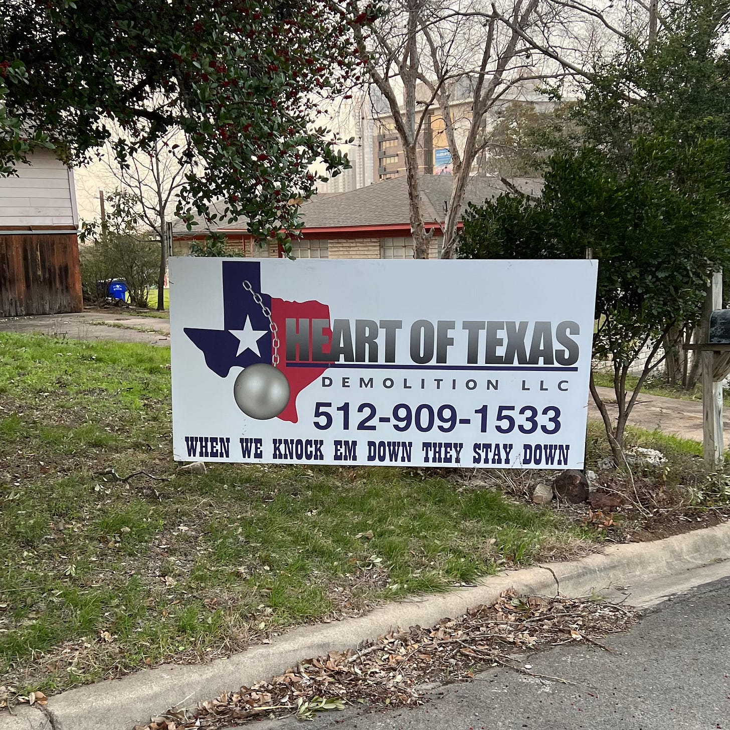Months ago, a billboard was erected on the street in front of the tree, announcing the demolition of the old house. I took a picture when I saw the sign, less because of the news about the house and more because of the brash machismo of the billboard itself. A gray wrecking ball sails in front of a Texas flag. And a tagline reads: when we knock em down they stay down. The English teacher in me wants to argue with this sign for both its lack of punctuation and the fallacy of its argument. Do demolished houses rise again under the cloak of darkness?