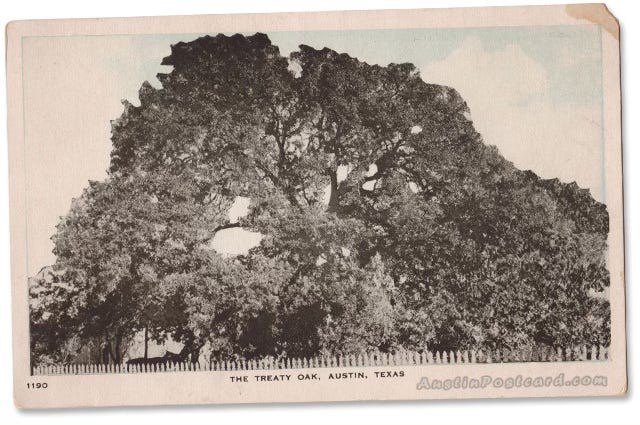 The most famous live oak in Austin is the Treaty Oak, a tree that still stands, or at least partially stands, over in central Austin, not far from the flagship Whole Foods store. It’s estimated to be 500 years old, and one of a group of legendary Council Oaks. Though there is little evidence proving their existence, the Council Oaks were said to be trees where Comanches and Tonkawas held conferences, made pacts, and celebrated ceremonies. The last of these trees, the Treaty Oak, is supposed to be where Texas founder Stephen F. Austin signed a boundary agreement with Native Americans in the 1830s. That historians have argued this unlikely has done little to dampen the tree’s fame.