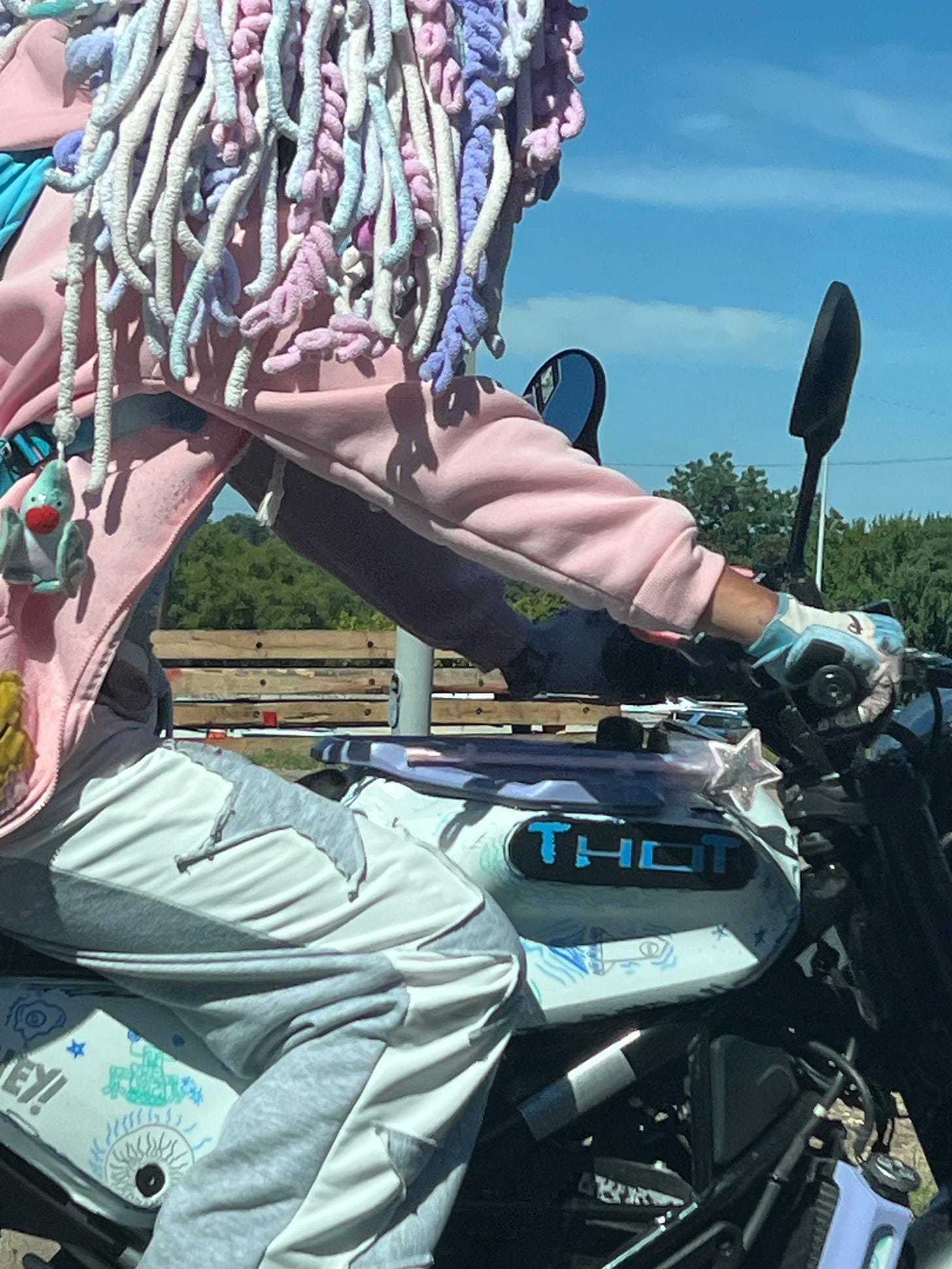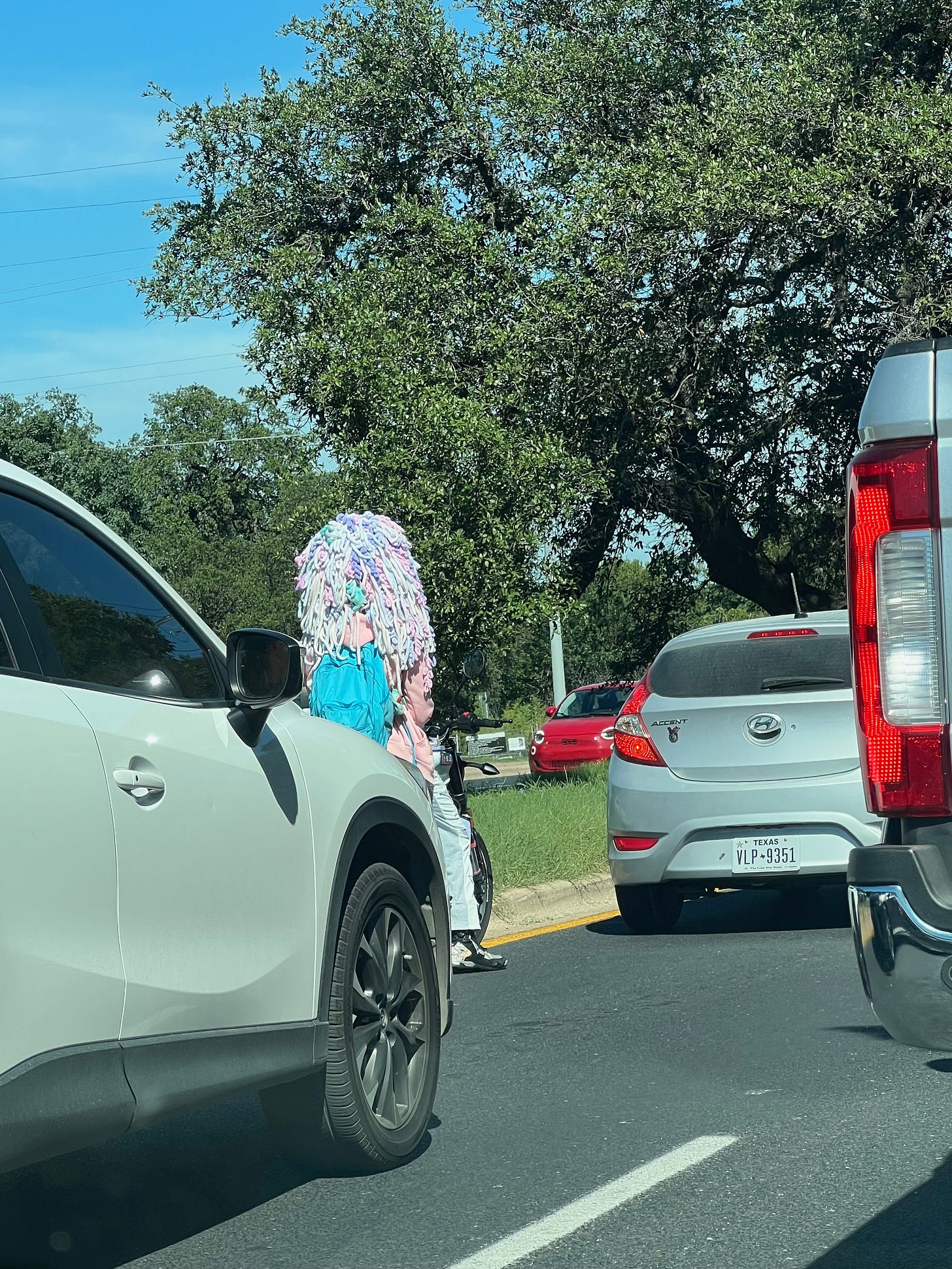 As I inched forward in traffic, I finally pulled up beside the wig. I found tucked somewhere beneath it a man bent over the handlebars of his motorcycle, intent on wherever he was going. His pants had a giant stars on them, his face was concealed beneath the strands of colorful rope. I wondered if he wore a helmet under the wig, or if he used a kind of magical thinking to believe the colors themselves could protect him.