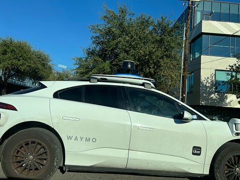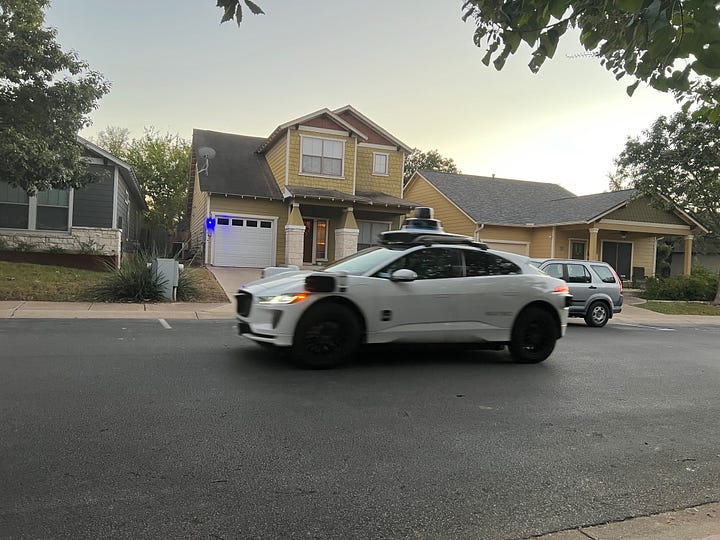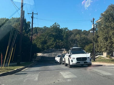 The Waymos are at the stop sign, in the parking lot, blinking in the turn lane. They are driving slowly down Lamar Boulevard, going the speed limit, or quickly down our street, going the speed limit. As we sat in front of the house of friends greeting trick-or-treaters on Halloween, we saw a Waymo navigate the clusters of kids in costumes, not hitting anyone, but going faster than any decent human would around all those tender and cute children.