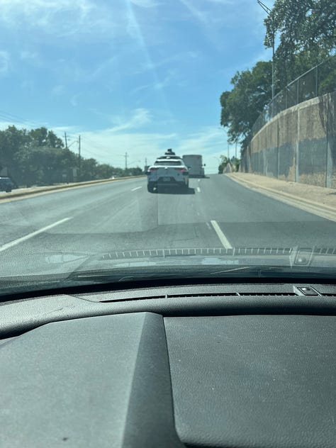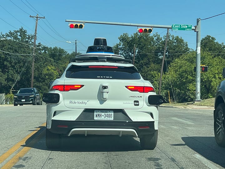 Let me be clear for those who don’t live here: the roads in Central Austin are filled with cars with no humans in them, or cars with humans in the backseat and no one up front. In any cluster of traffic—and Austin traffic deserves its own superlatives—there will be at least one, but often several, autonomous cars. Mostly they are the Waymos, white Jaguars of a nondescript style, noticeable only because of the technology spinning on the roof.